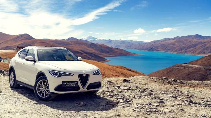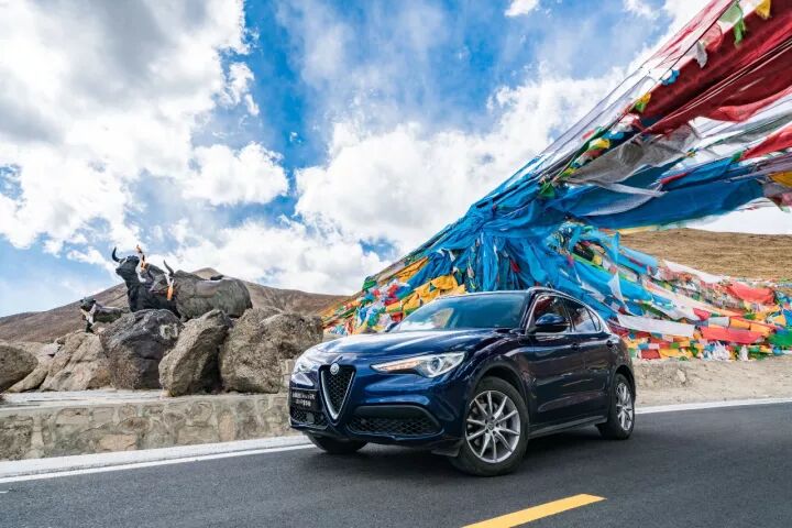 所以这次西藏行,从林芝开始一路驾驶Stelvio,翻过雪山,穿过丛林,路过村庄,征服各种地形,抵达一个又一个的高度,在西藏壮美的山峦下,阿尔法罗密欧独具一格的盾形进气格栅,更显赛道之王的霸气。