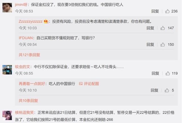 据微博网友爆料,有客户已经收到银行短信,要赔偿3倍保证金。该名投资者提出质疑:“银行50%提醒和20%斩仓风控根本完全没有提示”、“跳楼的保险金也赔不起”。