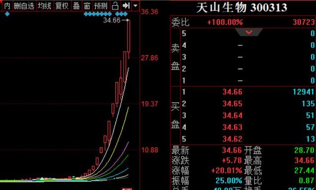 天山生物:两市总龙头,今天低开高走尾盘涨停,明天应当要高开加速去挑战年内10倍目标了。作为两市人气最高的票,即便见顶也会高位震荡挣扎一阵子,利润厚实的朋友,最简单的策略就是盯紧5天线,想参与的把握一条原则,轻仓找分歧机会低吸。