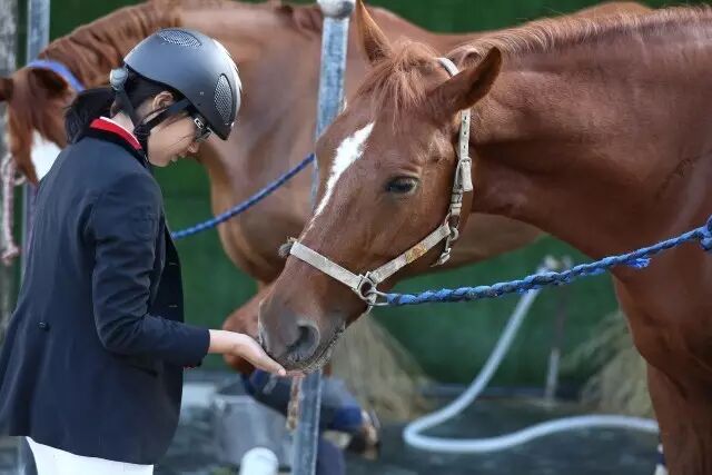 在谈起自己今天的表现时,天沛显得很谦虚:“我的发挥有待提高,后半场马匹的节奏控制的不是很好,但是我的马帮助了我很多。我本来有点担心,但没想到它非常勇敢。”今年9岁的比利时温血马ClicClac与天沛搭档了2年,她们的相遇也算是“一见钟情”,天沛第一眼见到它,就决定将它买下来。“在最初的磨合阶段ClicClac对我的指令并不是特别服从,经过长时间的训练,我俩越来越默契。现在我俩也不见外了,我不带吃的给它,它就不搭理我,倒是很喜欢跟好看的小姐姐玩。“说到这里,天沛有些忿忿不平。