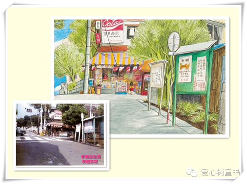 再以《第一次上街买东西》为例。这本书给我们很鲜活的感觉,场景也好像是发生在身边一样。为什么呢?这是因为林明子在创作时就是从现实中取材的。下图是真实的照片与她最后完成的画的对比。她画的地点是东京的自由之丘,是现实存在的地方。值得一提的是自由之丘也是《窗边的小豆豆》中巴学园的所在地。