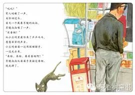 在墨镜叔叔这张画面里,因为墨镜叔叔的形象就像陌生的男人,对于小女孩来说是一个心理冲击。这里猫的表现跟美依的心理是贴合的,都是害怕的感觉。到她买完牛奶之后,那只猫就很放松地走了。当时在创作的时候,筒井赖子删掉了一些文字。用文字表现故事和用图画表现故事是两种方式,但是图能表现的,文字就要删掉,因为文字是作家的心血,筒井赖子说删的时候虽然心里很不舍,但是看到图这么好也就心甘情愿地把文字删掉了。