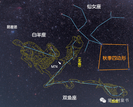 探索秋季的星座时首先要找到仙后座。面向难免仰头看天,仙后座呈W形,面向北面仰头看仙后座呈M形。面朝南方,将仙后座中间的那颗星和下方的星星连起来,再沿着这条连线的延长线向下,就能找到一颗2等星,这是仙后座头部的壁宿二。在壁宿二附近还有3颗亮度差不多的星星,比壁宿二共同构成了“秋季四边形”,是秋季星空的标志。