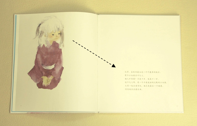 为了保证细节的完美,编辑不断调整字型、字距、字块与边缘的距离。日文与中文的字数差别很大,这也给编辑带来了很大的挑战。你看,在下面的跨页中,文字部分随着小女孩恬静的目光中自然地带出来。