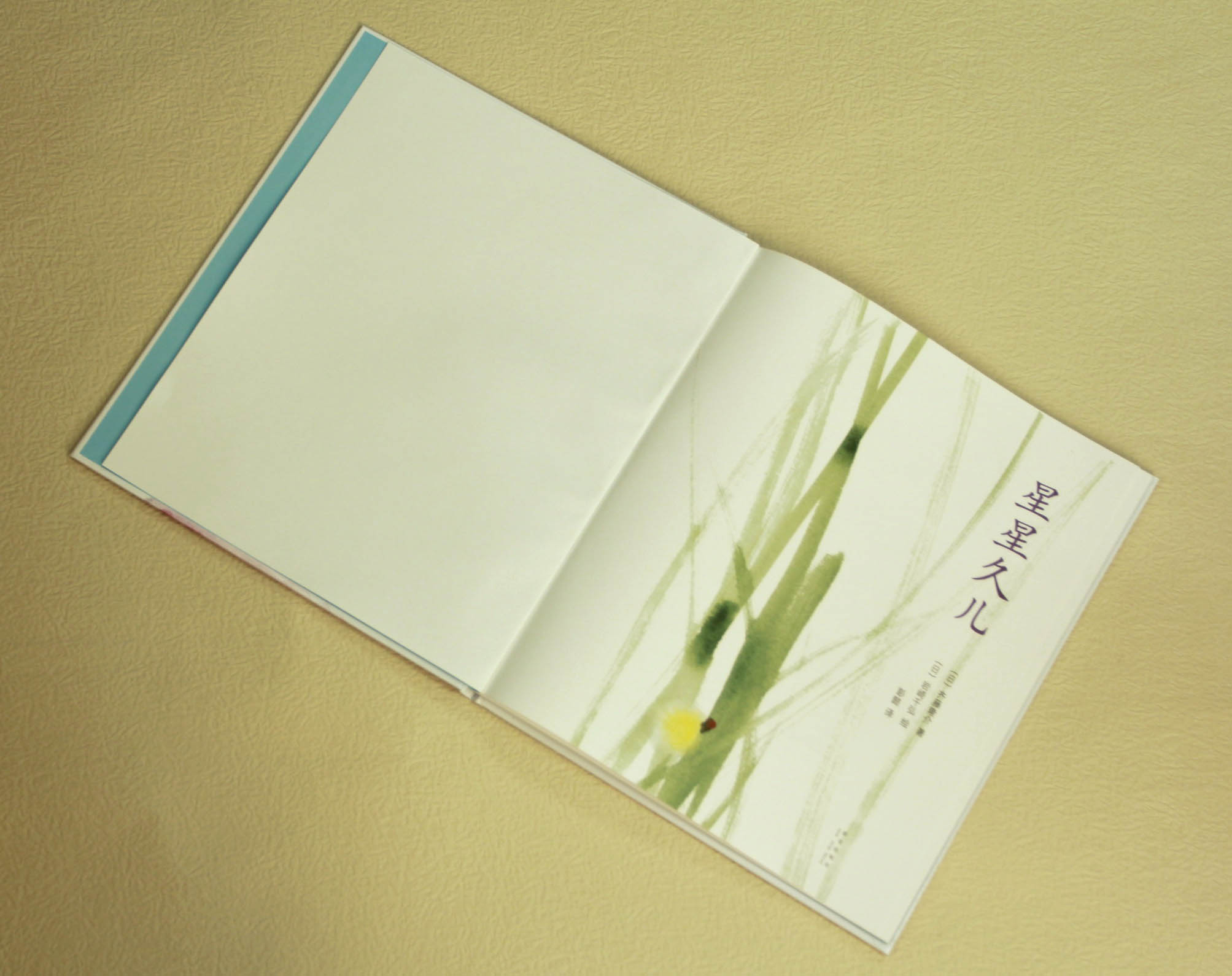 排版在书籍的制作中占非常重要的地位,好的排版能够让读者在阅读时能够跟随文字停顿、翻页,有思考的时间。绘本中有大量的图画,排版更为重要。像《星星久儿》这样文图配合紧密的绘本,更注重文字的排版。文字不能压到图画,字块大小与页面大小的比例要合适。
