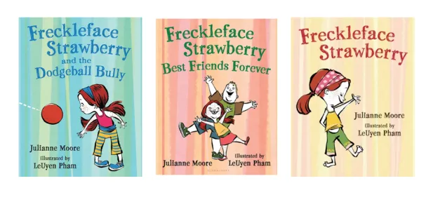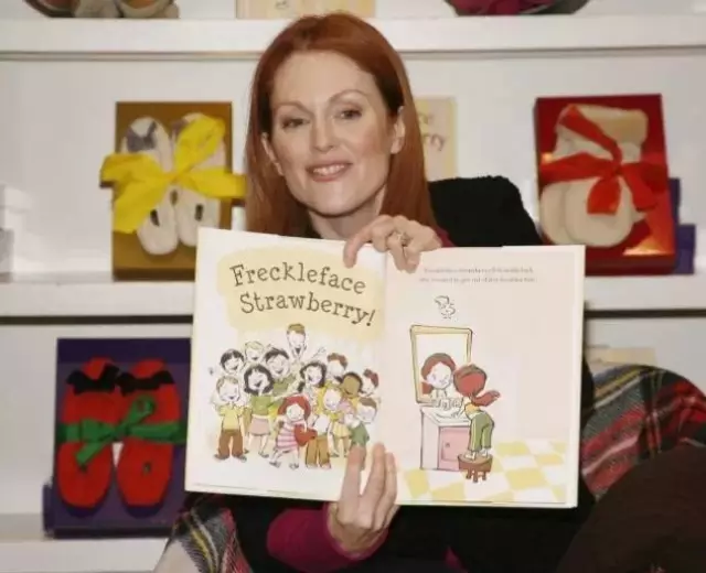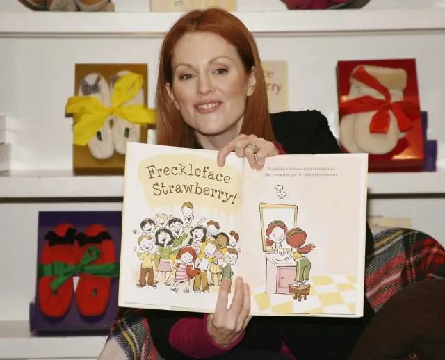 从影二十多年的朱丽安·摩尔,跻身童书作家行列。她拿童年造成烦恼的绰号大加发挥,写成图画书《可爱的小雀斑》(Freckleface Strawberry)。
