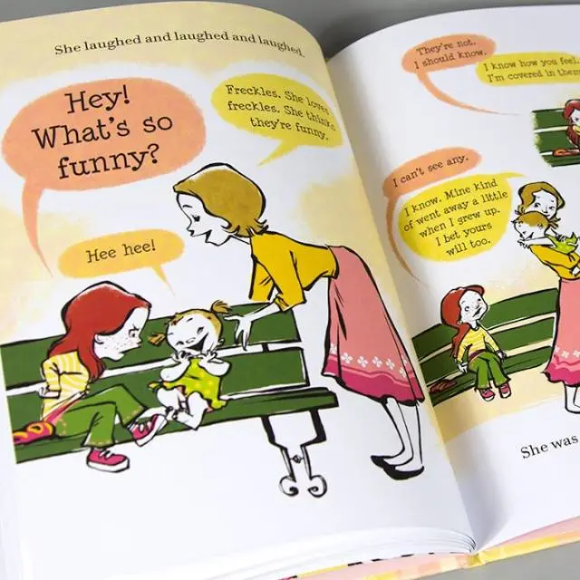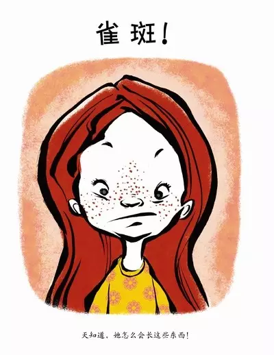 故事是摩尔的亲身经历:“小时候,别的小孩都叫我‘麻子脸草莓’,我恨透了。”书里的七岁小女生,一头红发、满脸雀斑。无论她上哪儿,总有小朋友对她的雀斑指指点点:她长了斑、她很脏、活像长颈鹿;更恶毒的,叫她是“麻子脸草莓”!