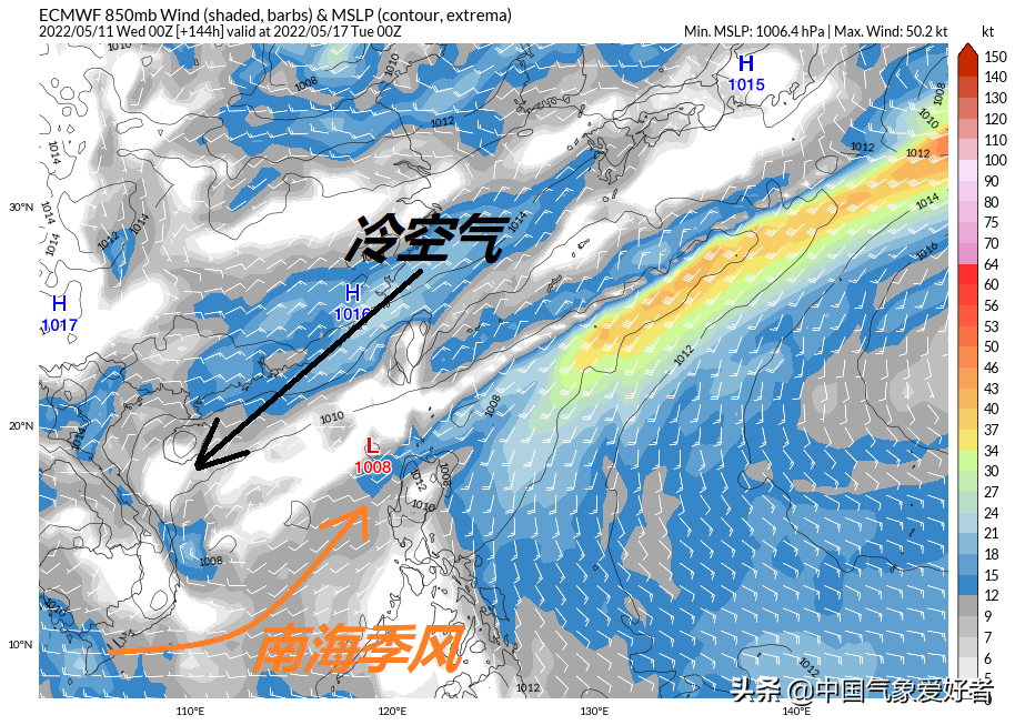 从目前的预测上看,这股冷空气的南下最终大举深入到广东广西福建,并且将在5月17日前后把西南风压回到南海深处——简单点说,就是冷空气把刚刚爆发的南海季风击溃,可见这股冷空气威力非比寻常。中央气象台首席预报员张涛表示:爆发的南海季风被爆锤了,这个5月中旬的时节,冷空气能向南推进到向南海南部,可以说职业生涯仅见。