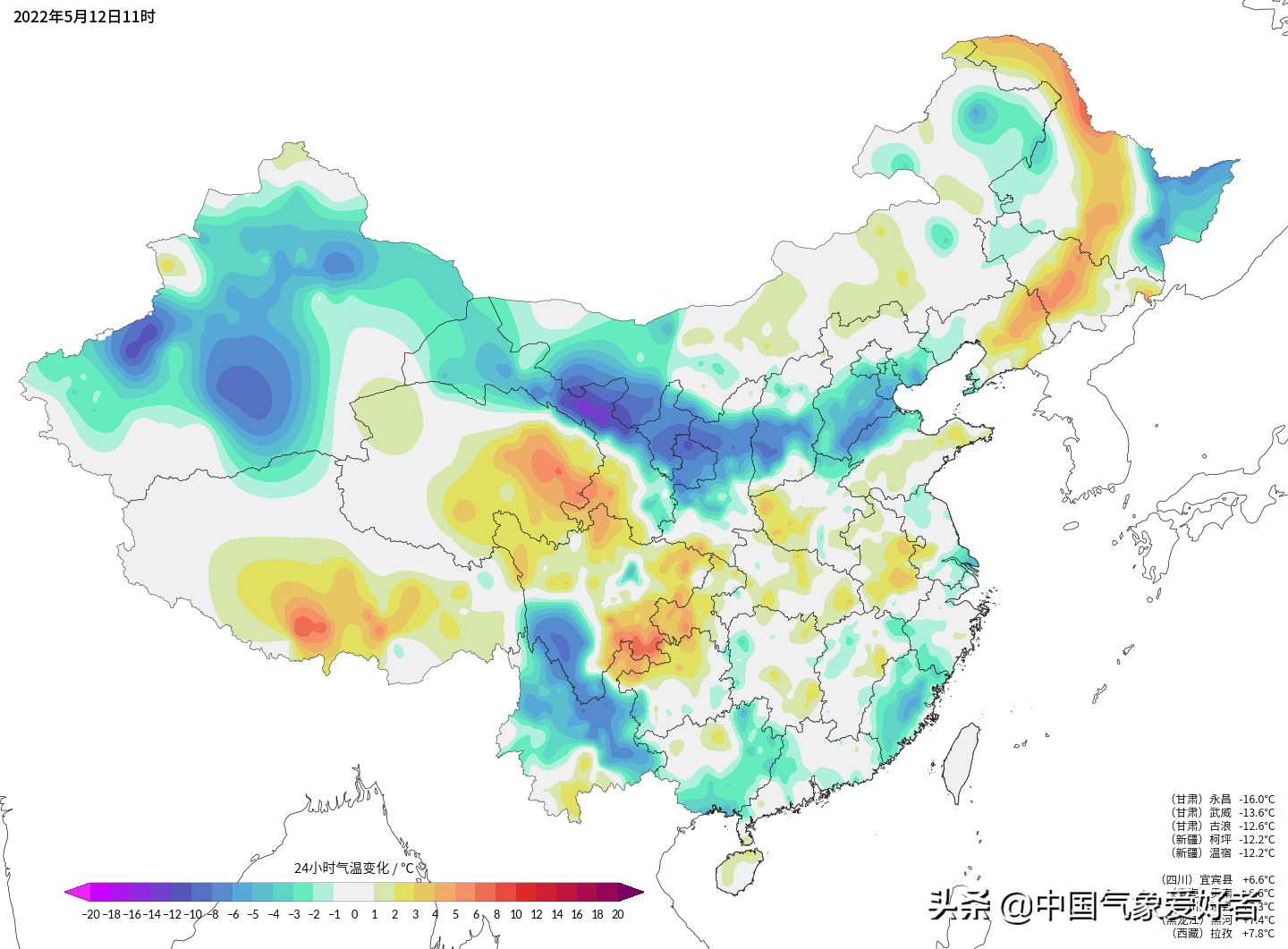 不过今年的情况有点特别,一是南海夏季风较常年同期爆发偏早,二是强大的冷空气正在划过北方,这两天内蒙古、黑龙江寒潮预警频发,多省出现剧烈降温,甚至局部还下了雪,像是5月12日上午11点,从24小时气温变化图上看,这股冷空气的降温威力已经来到了西北、华北多地。