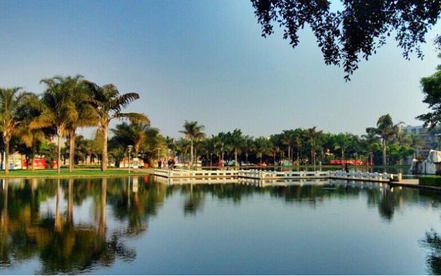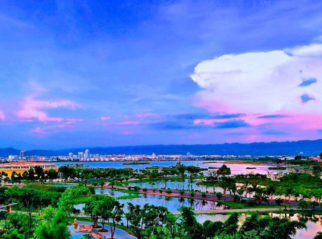 弥勒,水做的城市,一座湖泉生态门园,占了半座城,生态园占地三千多亩,湖面映着天际,气势恢弘,碧波荡漾,两岸青草绿地,椰树林立,花草成丛,令人心旷神怡。