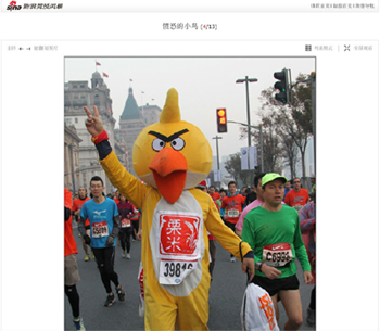 于是,就出现了马拉松赛场上那只背着米袋子奔跑的愤怒的小鸟,这只背着米袋子,浑身贴满二维码的小鸟吸引了大量媒体的关注,连上海马拉松最美丽选手廖智都来合影,这个“愤怒老板”登上了各大新闻头条,