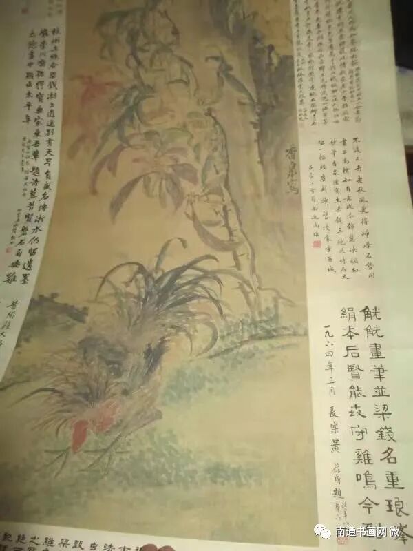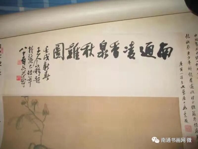 那天,凌老关门闭窗后,从櫃子里的一堆轴画里拿出一帧画轴,这是一件大六尺的画,望着诗堂上扑面而来的“南通凌香泉秋鸡图”八个遒劲大字,凌老介绍说,这是他于1982年春节期间,赴上海请时年八十六岁的上海画院名誉院长、中国美术家协会理事王个簃先生题写的。