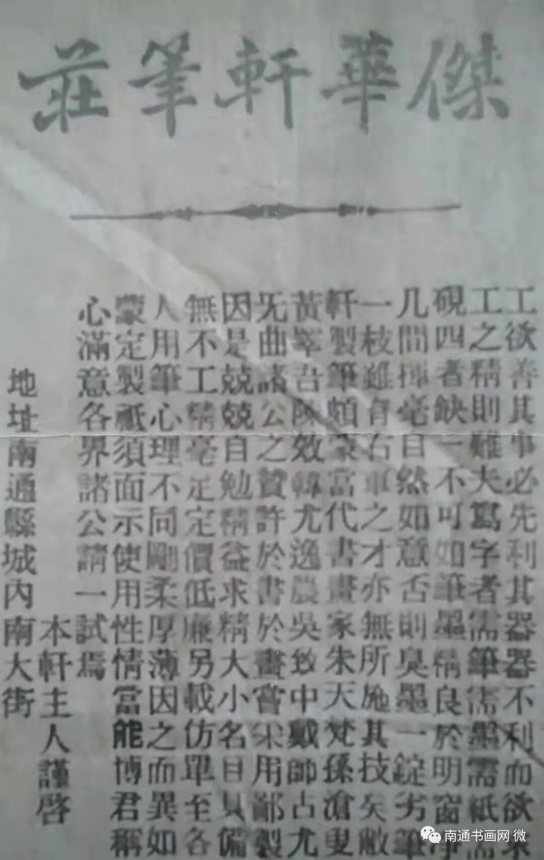 每每聊到孙儆,凌老都是充滿了敬意。有一次在他的寓所我们又聊到孙儆,他起身从书橱里找出上个世纪四十年代,他父亲凌杰华在南通开设“杰华轩笔庄”时刊登在《通通日报》上的广告词:“工欲善其事必先利其器,不利而欲求工之精则难,夫写字者需笔、需墨、需纸、需砚,四者缺一不可,如笔墨精良于明窗净几间挥毫,自然如意,否则臭墨一锭、劣笔一枝,虽有右军之才亦无所施其技矣。敝轩制笔颇蒙当代书画家朱天梵、孙沧叟、黄睪吾、陈效韩、尤逸农、吴致中、戴师古、尤无曲诸公之赞许,于书于画,尝采用鄙制。因是竞竞自勉,精益求精,大小名目具备,无不工精毫足,定价低廉,另载仿单。至各人用笔,心理不同,刚柔、厚薄因之而异,如蒙定制,祇须面示使用性情,当能博君称心满意。各界诸公请一试焉。本轩主人谨启,地址南通县城内南大街。”