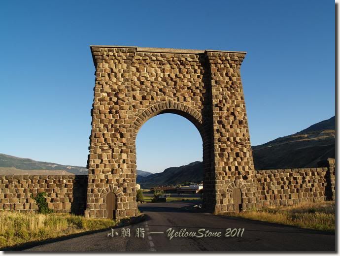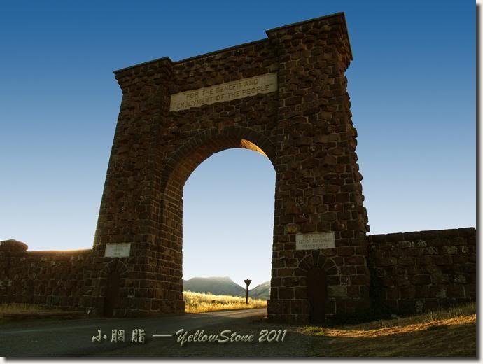 2.1、早上起来,紧邻Gardiner小镇不远就看到了有名的Roosevelt Arch(罗斯福拱门)。这个由石头堆砌的大门就是黄石国家公园的北大门,也是黄石国家公园的最原始大门。最上面写着:For The Benefit And Enjoyment Of The People(为了人民的利益和享受),我想这也是建这个公园的初衷吧。早上照拱门正面有点背光。