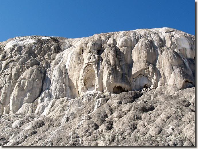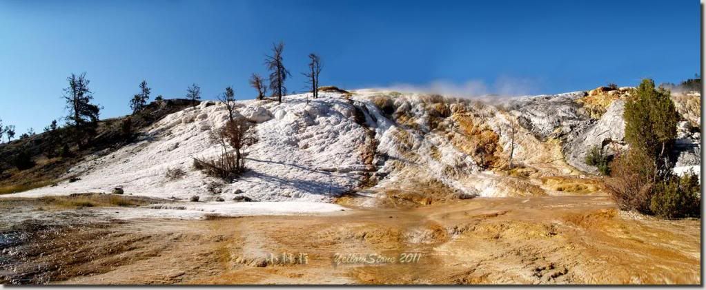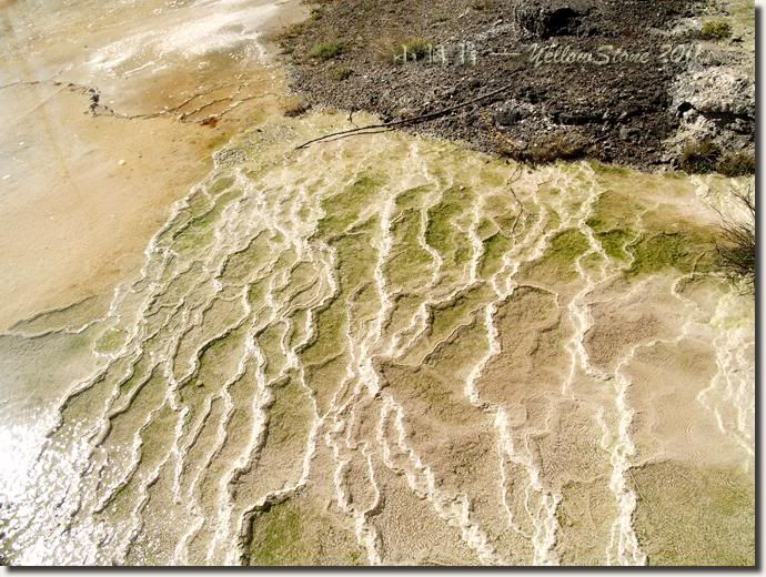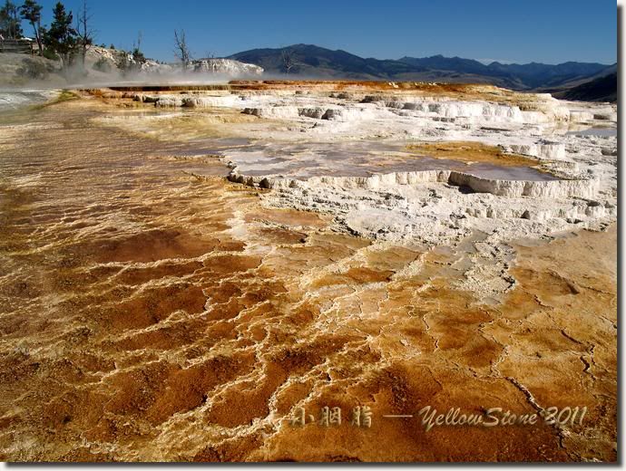 Springs最迷人的是泉水孕育的五彩梯田。因为这里的地质主要为松软的石灰岩,热水喷发的时候,细菌顺着山坡的水流一节一节流下来,很快侵蚀并且白色的结晶沉积在岩石表面而形成了这种一层一层的结构,便形成了我们眼中怪异的台阶。http://i207.photobucket.com/albums/bb157/lxcgood/Yellowstone%20NP/USApark132.jpg----