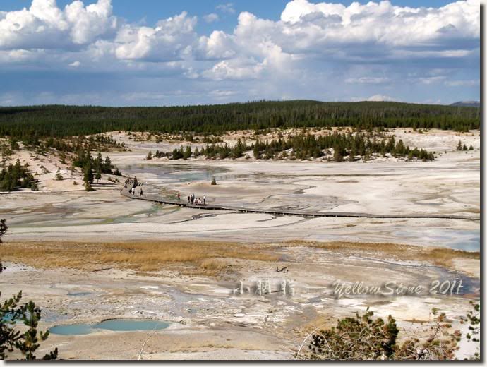 2.8、Norris Geyser Basin。 Norris Geyser Basin是很大的一片Geyser,这才能看出一点Basin的感觉。需要一提的是这里硫的味道特别浓,算整个黄石园区最重的。有时候熏得人都睁不开眼,基本我们都是捂着鼻子游览的。近年来Norris Geyser Basin接连喷出有毒高温气体,地表也一直在匀速隆起,2003年夏天为了保障游客的安全,公园曾封闭了这部分景区。可以说去黄石公园旅游的人就是走在一个很大的火山口上面, 但这些也阻挡不了众多游客的光临。