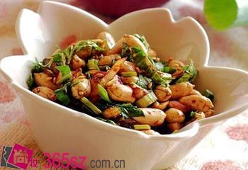 使用原料:干鱿鱼100克,猪里脊肉150克,冬笋200克,韭黄150克,料酒、胃镜、精盐、香油和淀粉各适量。