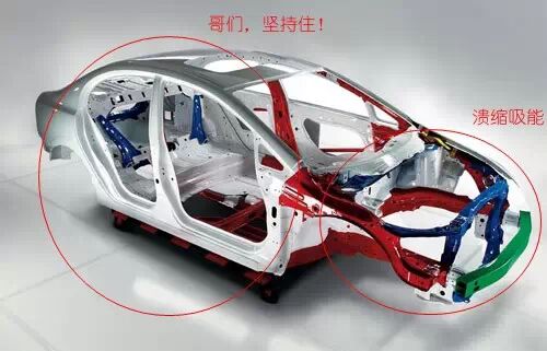 发动机舱和尾厢部分要软,因为要碰撞吸能;驾驶舱部分的ABC柱、车顶横梁以及车门大梁要硬,因为要保证驾驶舱在任何方向的碰撞中都可以减少变形,以减小对乘员的压迫;内饰部分要软,因为要避免驾驶舱溃缩的过程中刺伤乘员。那么你又要跳出来了:“那前方变形那么厉害,怎么可能会保护驾驶舱呢?”再打一个比方,你站在一个稍微高一点的地方(不用太高,路牙石就行),往低处跳,膝盖保证不回弯。落地时,我保证你那一瞬间大脑震了一下,甚至有些轻微脑震荡的感觉。膝盖没弯,没有吸收能量,而骨骼是坚硬的,不可以吸能,那么就只能交给内脏和大脑来吸能。你觉得这样你会舒服吗?