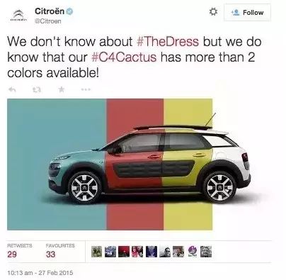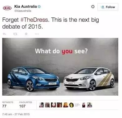 以上是通过上周的大家热议的#TheDress话题想到的,很多车企借此机会也或多或少刷了刷存在感,文案优劣每个人心中都有一个标准。希望以后能够有越来越有文化有内涵的话题带动越来越精彩有趣的文案出现。