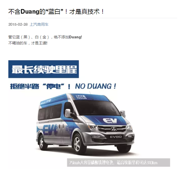 去年在广州车展上亮相的上汽大通纯电动轻客——EV80也借此机会在其官方微信号上继续宣传它的卖点——续航里程,绿色高效以及高技术水准。近来最流行的热门词汇“蓝黑白金”、“Duang”、“环保”等都加入到宣传(文案)中来。所以小编个人还是比较喜欢上汽大通的文案的。(没)有前面两类晦涩难懂,直白的宣传语容易引起读者兴(趣),并且还传递较多信息,也(就是)说,单位时间我们了解到关于产品的更多特点。优秀的文案具有“不盲目效仿”“不肆意(剽窃)”的特点,并且还可以吸引转发,扩大阅读(流量)。上汽大通的文案符合优秀文案的特点。