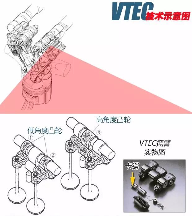 与大众一样,本田VTEC发动机也在凸轮轴上做了高低两套凸轮,而与大众整体移动凸轮轴不同,VTEC的精妙之处在于,低角度凸轮切换高角度凸轮时,只要移动气门摇臂上的卡销,将低凸轮气门摇臂和高度轮摇臂通过卡销锁在一起,就可以实现高凸轮的运作。