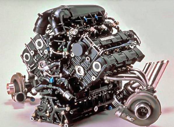 1987年,本田发布了RA167E,将小排量涡轮增压引擎发展到极致。其实早在85赛季本田的马力优势就已经显现了出来。到了87年这个差距不但没有缩小,反而拉开得更大了。80°V6双涡轮,排量1494cc,缸径79mm,行程50.8mm,压缩比7.4,增压压力4Bar,转速14000,可做到1050匹,660牛米扭矩。