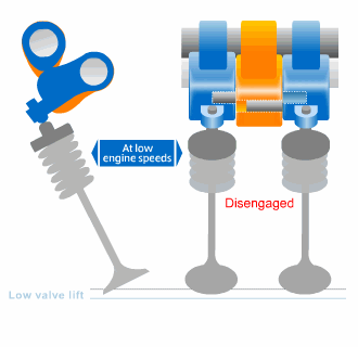 这张GIF动图非常直观地解释了VTEC的工作原理,高低凸轮的切换,关键就在于卡销的移动。