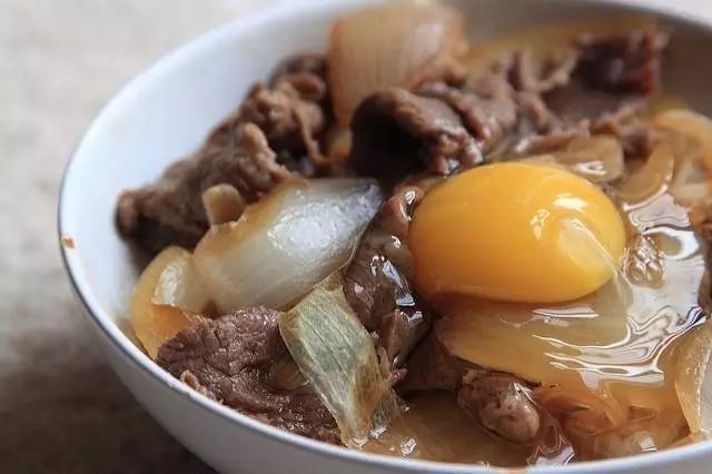 牛丼是日本战败后的发明。二战后日本经济的一落千丈。普通家庭很难吃上一顿像样的饭。于是很多人把屠牛后剩下的碎肉,夹在骨头、骨缝中的肉加以利用,配上洋葱和豆腐,煮得一大锅汁,然后淋在白饭上,这便是最早的牛丼。在碗内盛上米饭后,上铺一层碎牛肉片和洋葱丝,即可立即食用,“快速、便宜、好吃”成了牛丼的标签。食用时可配以腌制的洋姜丝,也可以在牛肉片上打上一颗半熟温泉蛋,香软的米饭加上滑嫩的牛肉再搭配蛋黄的香气,点上一份会有极大的满足感。