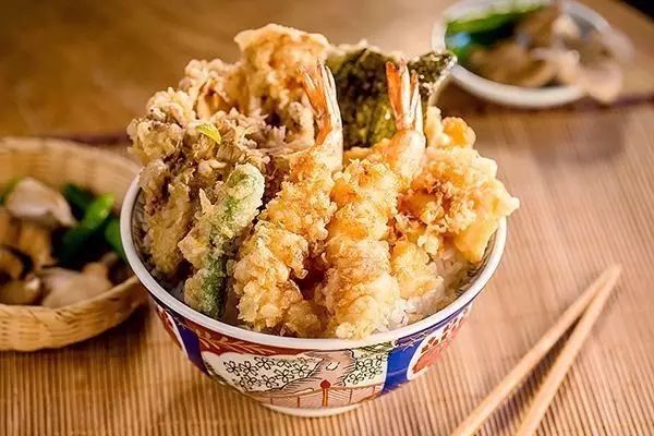 天妇罗是日式料理中的油炸食品,将新鲜的鱼虾和时令蔬菜裹上浆放入油锅炸成金黄色。吃时蘸酱油和萝卜泥调成的汁,鲜嫩美味,香而不腻。将黄金时间内炸制完成的天妇罗满盛上桌,浇一点秘制酱汁,再搭配柔软的米饭,粘附些许酱油,微甜胃咸。食用前将半熟的温泉蛋戳破,让蛋液充分与米饭混合,多层次的丰富口感,让人吃一口就会爱上这么一碗饭。