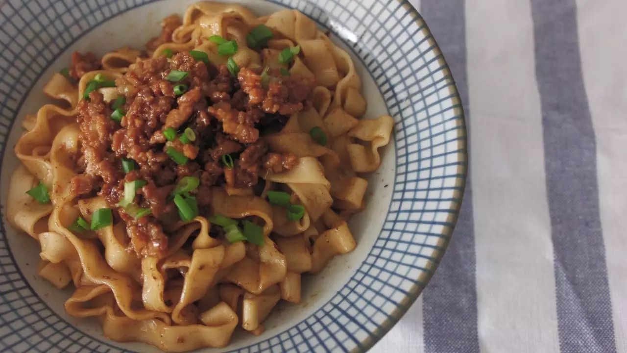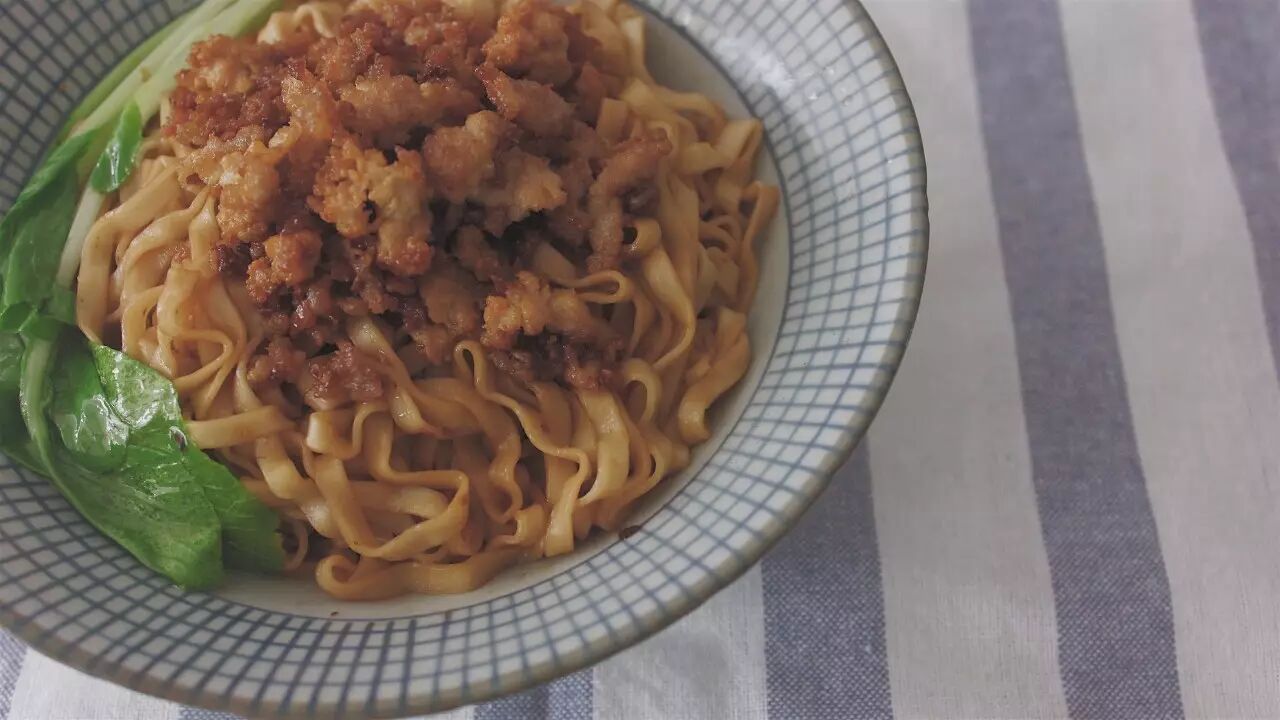 对于一些台湾人而言,来自客家的板条是他们童年里古早味的记忆载体。当大森拆开这款客家板面的时候,觉得这板面与我们平常吃的宽面有些类似。板面煮的时间略长,需要五分钟。拌上香气逼人的沙茶酱,浇上一些肉燥,撒入一些葱末。一碗简单的客家板面就制作完毕。面条Q弹有韧性,配上均匀的海鲜味十足的沙茶酱显得非常棒。
