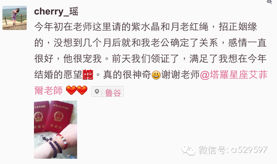 #幸福接力,结婚沾喜#看见艾粉从老师这边请的月老红绳和根据她的八字建议配戴的紫水晶,就觉得非常的亲切,尤其是看到艾粉领到结婚证,幸运的愿望实现了,也感到开心和满足,觉得自己身为月下老人的弟子,能帮助一对粉丝佳偶天成,都是月下老人赐福。记得转发接受喜气喔!https://mmbiz.qlogo.cn/mmbiz/osickG6kM9H0VPkpCTwyClIV0bpw62rib96VT5d6miaOWGzpPZygS6O2jF6UicVS0V5E6eO5Ah1SFjvq6oSxwJs0icg/0相信大部份的人每天都过着忙碌的日子,有时真想停下来喘口气,但是碍於要生活,大家都是咬紧牙在撑,而艾菲尔老师也要告诉艾粉,不论你手中拥有的东西多麽微不足道,只要你能从其中发现幸福,知足的充实感就能使你的内心清澈如镜。现在也一起来看一周运势吧,转发朋友圈,提醒朋友未来一周的变化。