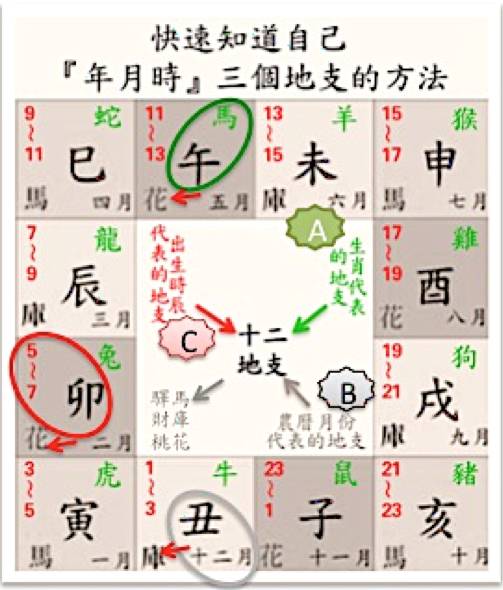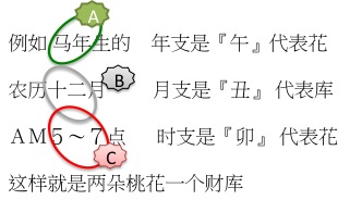 八字的12地支『子丑寅卯辰巳午未申酉戌亥』分别在『年丶月丶日丶时』四柱,各有一个,共四个字,但老师提供一个简单方法让大家查自己的『年』『月』『时』三个地支,就可以知道自己的财库,桃花,驿马大概的分布,今天先來看桃花的部分!看看自己是不是桃花朵朵的万人迷吧。有点小复杂,记得提醒朋友帮你看看。
