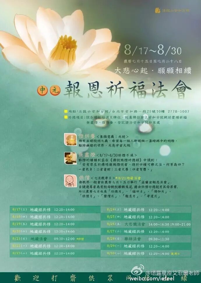 今天8/11是鬼月期间【诸事不宜】的第三个日子(阳历),想要做决定或是红白喜事都不宜,同时请勿吵架!8/17(农历7月15日)是中元节,老师会参加地藏经法会,要为全家人添香消灾的,为自己祈福求平安丶或超度无缘子女丶冤亲债主的,请和老师微信联络。