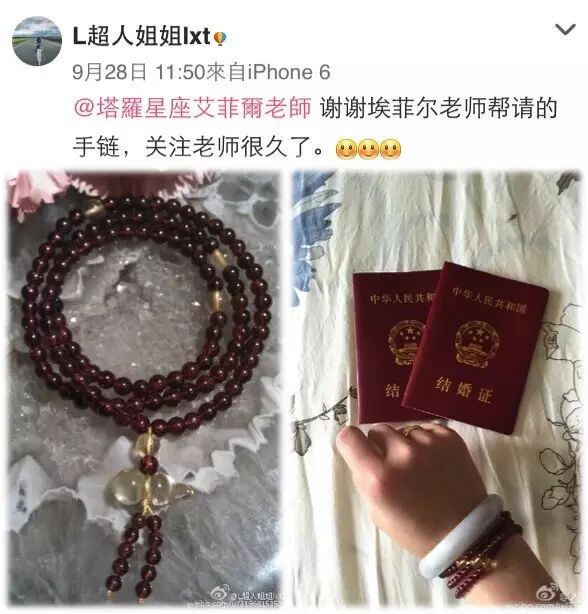 前几天收到一位艾粉的结婚喜讯,很开心她在这个浪漫的秋季定下自己的终身大事!相信手炼就是她的幸运物!老师会到庙里为她还愿,感谢神赐良缘!愿看过这个幸福见证的人,都能够心想事成丶姻缘美满!