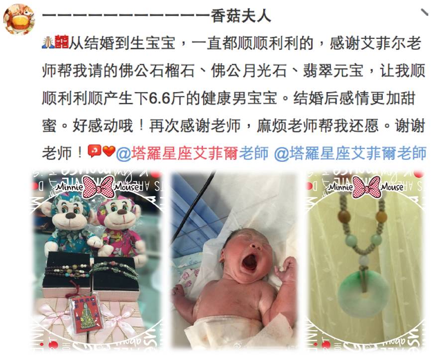 另外,老师很开心!有位艾粉佩戴了老师用五行八字推荐佩戴的【手炼与平安扣】,顺利生了个漂亮健康的宝宝,而夫妻之间的感情也越来越甜蜜!特别转出来与你分享!老师会帮她到庙里还愿,大家一起来沾沾喜气吧!