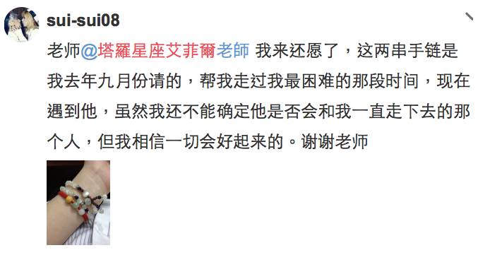 分享好运,会更开运。恭喜这位粉丝佩戴开光手炼,走过最艰困的时期,遇到好对象。个人专属开运水晶、命理咨詢,可直接微信老师,老师亲自帮你推荐。