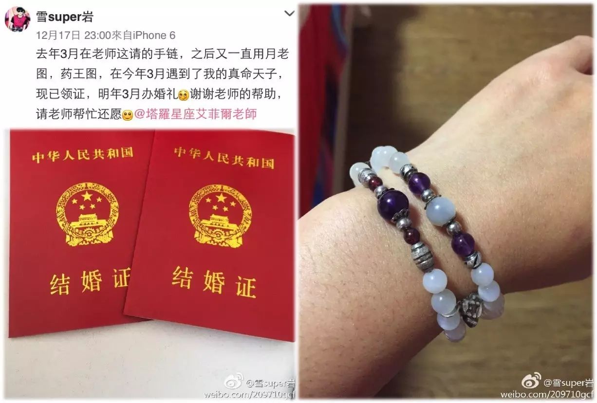 这是老师今天收到最开心的喜讯,特别转出来和你分享!很高兴这位艾粉佩戴了老师用五行八字推荐的『开运手鍊』,找到真命天子也已经结婚领证,大家一起来沾桃花与喜气!老师会帮她到庙里还愿,希望看过这个幸福见证的你,也能觅得良缘丶幸福美满!在老师的官方微信a529597输入【月老图】,可下载人人称奇的灵图!