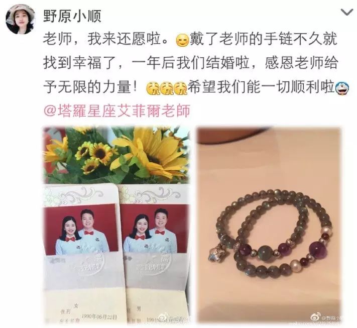很开心在春节後收到一位艾粉的喜讯,她佩戴了老师用五行八字推荐的『开运手炼』,已经和另一半结婚领证,大家一起来沾桃花与喜气!老师会帮她到庙里还愿,希望看过这个幸福见证的你,也能找到真爱丶心想事成!