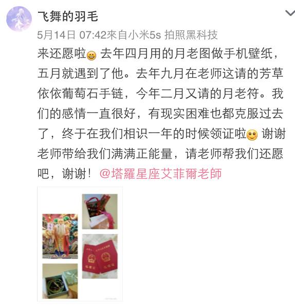 很高兴看到这位幸福的粉丝来跟大家分享她的结婚喜讯,特别恭喜她佩戴了老师用五行八字推荐的『芳草依依葡萄石手炼』和『月老符』後顺利领证。老师会到庙裡帮她还愿。大家赶紧来沾沾她的喜气,愿看过此见证的人都能觅得良缘丶幸福美满!