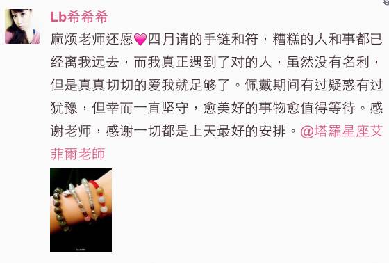分享好运,会更开运。恭喜这位粉丝配戴开光手链,遇到对的人!个人专属开运水晶丶命理咨詢,可直接微信老师,老师亲自帮你推荐。