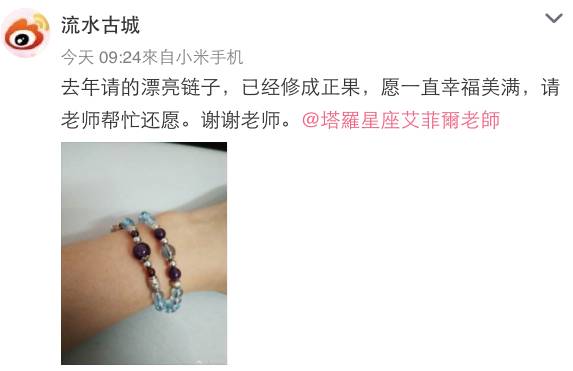分享好运,会更开运。恭喜这位粉丝配戴开光手链,感情开花结果!个人专属开运水晶丶命理咨詢,可直接微信老师,老师亲自帮你推荐。
