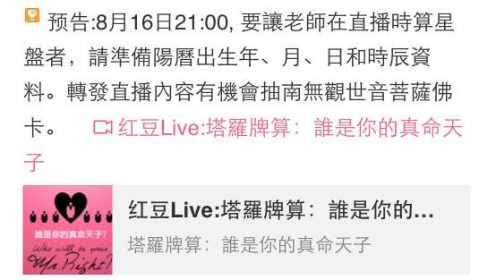 约吗?今天8/16晚上21:00,老师在【红豆Live直播】呦~老师要帮你看星盘!转发直播内容,有机会抽南无观世音菩萨佛卡。还没下载红豆Live的艾粉们,也可以直接在【新浪微博】收听,千万别错过喔!