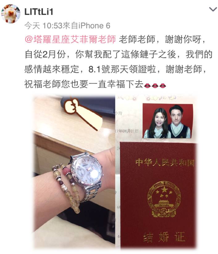 这是老师收到的喜讯,特别转出来和你分享!很高兴这位艾粉在8/1完成人生中的大事,大家一起来沾沾喜气!老师趁著七夕到月老庙里还愿,希望看过这个幸福见证的你,也能愛情順利、修成正果!8/28是七夕情人节,在这天向月老祈求姻缘的能量最大!老师会到月老庙为艾粉祈福,需要代为祈福的人亦可直接微信老师。
