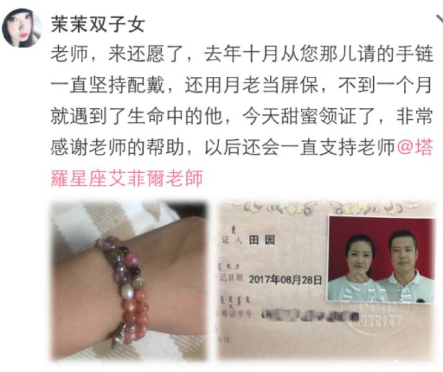太开心了!粉丝佩戴了老师用五行八字推荐佩戴的「日月星辰澄月光手链」遇到命定对象,也顺利领证结婚了!大家都来沾沾喜气,感受一下结婚的幸福!想跟老师聊聊心事,或请购个人专属开运水晶,请直接微信与老师联系。