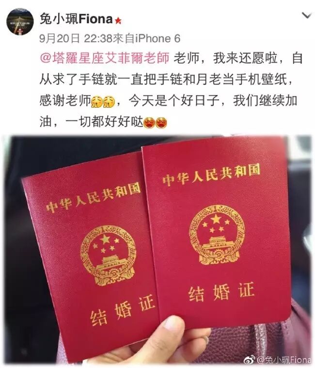 老师前几天收到一个令人开心的喜讯,特别转出来和你分享!很高兴这位艾粉佩戴了老师用五行八字推荐的『开运手炼』,已和另一半幸福领证,大家来沾沾桃花与喜气,老师会帮她到庙里还愿!希望看过这个幸福见证的你,也能找到真爱丶心想事成!