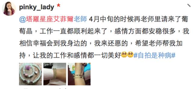 分享好运,会更开运。恭喜这位粉丝配戴开光手链,工作感情顺利!个人专属开运水晶丶命理咨詢,可直接微信老师,老师亲自帮你推荐。