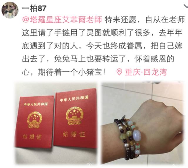 太开心了!粉丝佩戴了老师用五行八字推荐佩戴的「五行转运红绳与石榴石手链」已经幸福领证了!大家都来沾沾喜气,感受一下结婚的幸福!想跟老师聊聊心事,或请购个人专属开运水晶,请直接微信与老师联系。