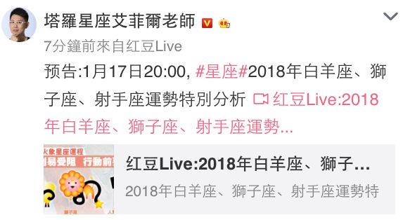 今晚约吗?今天1/17晚上20:00,老师在【红豆Live直播】要告訴你,白羊座丶狮子座丶射手座运势特别分析!还没下载红豆Live的艾粉们,也可以直接在【新浪微博】收听,千万别错过喔!
