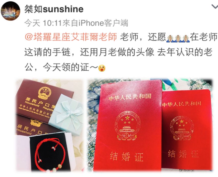 真的很开心,有位粉丝在新年期間,向老师分享她的结婚喜讯,她佩戴了老师用五行八字推荐的「姻缘手炼」,已和老公领证!大家一起来沾沾她的幸福喜气,愿看过此见证的人都能觅得良缘丶幸福美满!