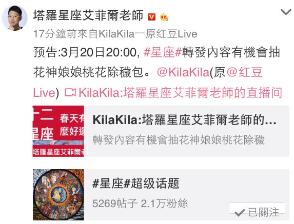 约吗?今天3/20晚上20:00,老师在【Kila Kila直播】(原红豆Live)有机会抽花神娘娘除秽包!还没下载【Kila Kila直播】(原红豆Live)的艾粉们,也可以直接在【新浪微博】收听,千万别错过喔!